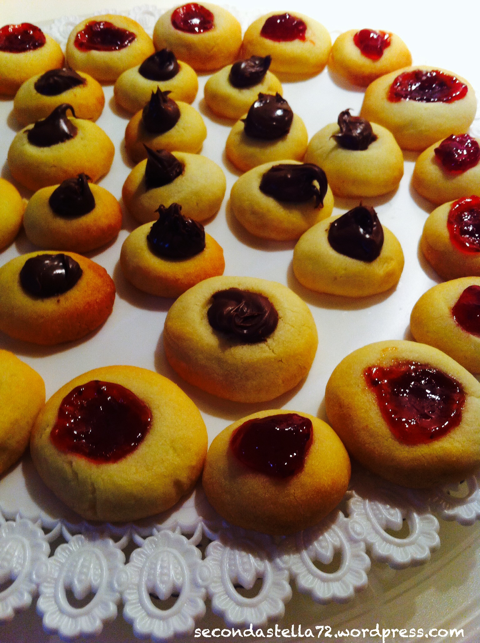 Per non buttare via tutto, ho cambiato forma dei biscottini, cercando di rimediare, utilizzando sia la marmellata di fragole che la Nutella, improvvisando la forma dei famosi biscottini “Ovis Mollis”.
