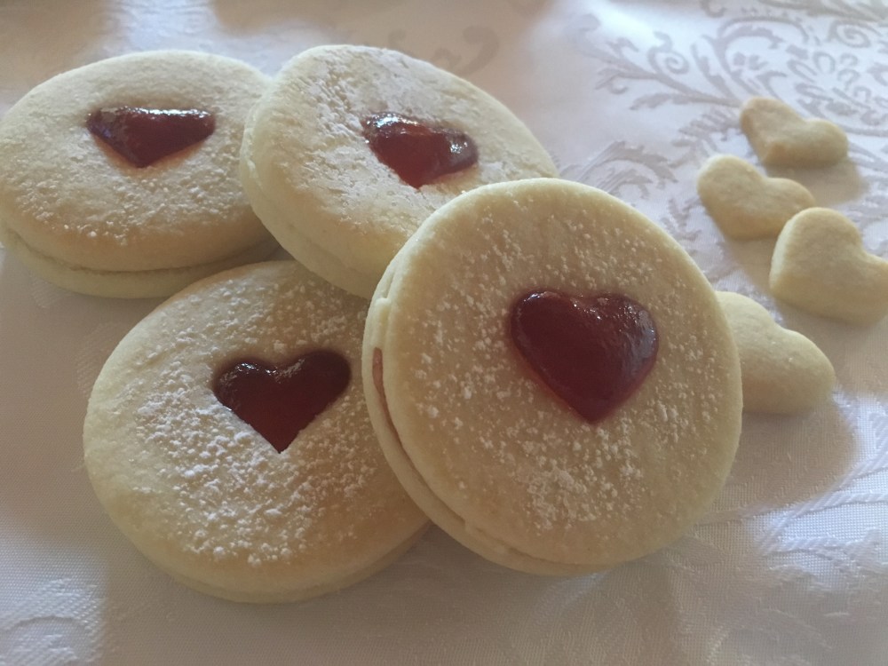 Solitamente hanno una forma rotonda, liscia o dentellata, con il centro del biscotto decorato e il ripieno di gelatina di bacche rosse.