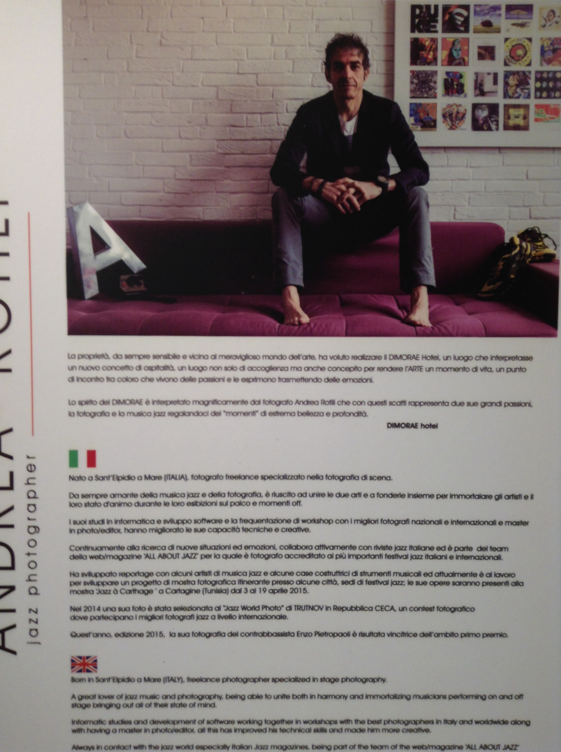 Non e’ chiaramente questo il caso del Dimorae Hotel di Civitanova Marche, dove siamo stati accolti con grande gentilezza. Con grande entusiasmo abbiamo appreso che l’albergo ospita una mostra fotografica dedicata a grandi artisti del jazz, lungo il corridoio del primo piano; l’autore, Andrea Rotili ha esposto momenti di musica jazz, numerosi artisti che si sono esibiti negli anni scorsi nelle manifestazioni jazzistiche più conosciute, come ad esempio Umbria Jazz, per citarne una. Tra i nomi Diana Krall, Fresu, Pino Daniele, George Benson e molti altri.