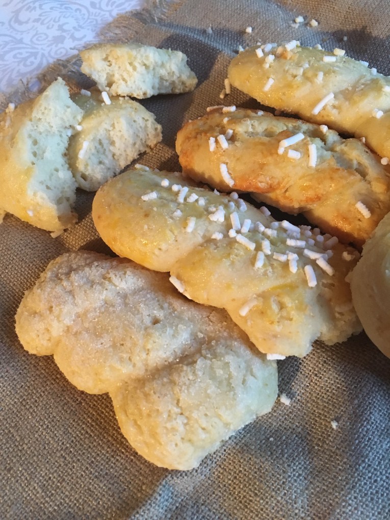 - Con il panetto, formate delle palline, dovranno pesare circa 60 g l’una; dalla pallina, formate dei filoncini e formate delle “treccine” (che non sono formate da tre filoncini, ma da uno solo, e, come se doveste formare un ferro di cavallo con il filoncino per poi attorcigliarlo su se stesso)