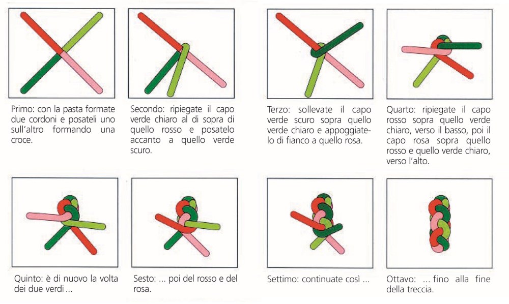 - Trasferite l’impasto sulla teglia e pocedete ora ad intrecciare i due filoni. Per la forma originale della treccia, potrete seguire questo schema che mi è stato inviato, e che grazie all’utilizzo dei colori è molto molto utile per la buona riuscita dell’intreccio. Piu’ stretta sarà la treccia piu’ sarà bombato l’effetto finale