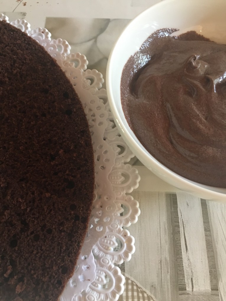 Questa base poi l’ho taglia a metà, l’ho bagnata con uno sciroppo di acqua e zucchero e farcito con una ganache al cioccolato che ho realizzato in questo modo: