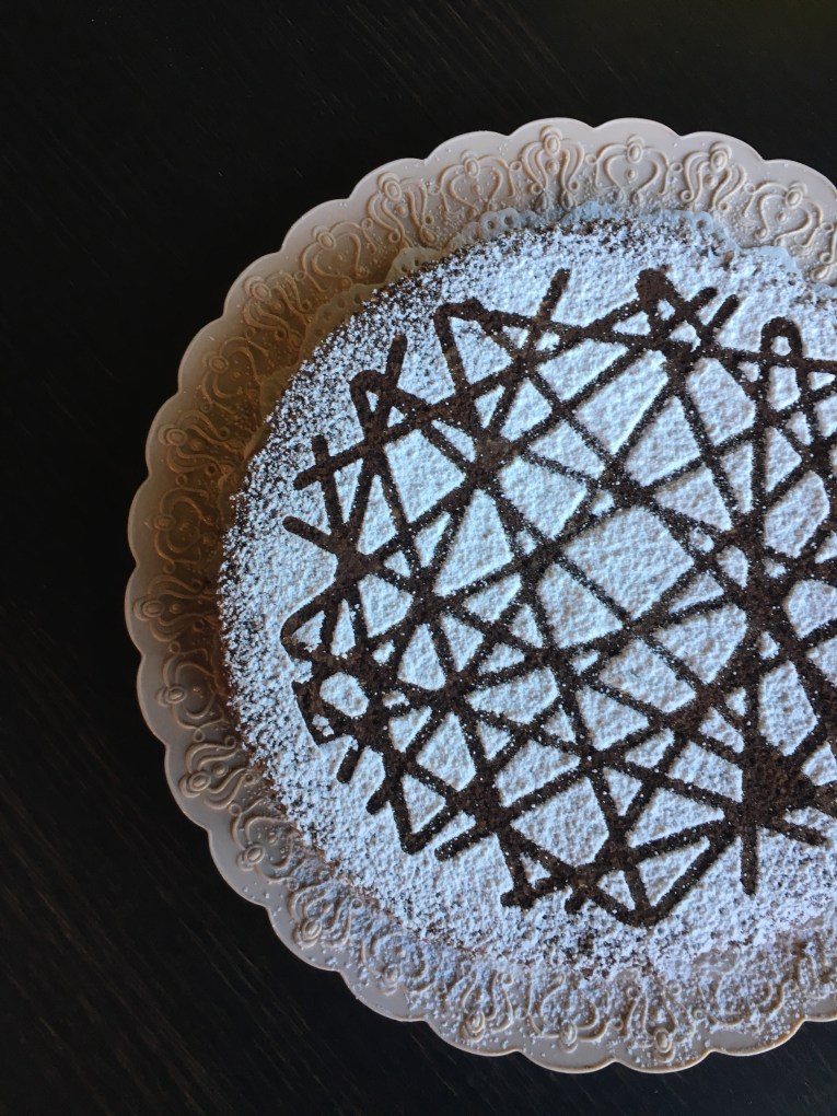 - Decoratela a piacere con abbondante zucchero a velo, utilizzando uno stencil o delle formine o un centrino. Io mi sono ricordata di avere un bellissimo sottopentola in acciaio dalla sagoma geometrica e così ho deciso di utilizzarlo come fosse uno stencil.
