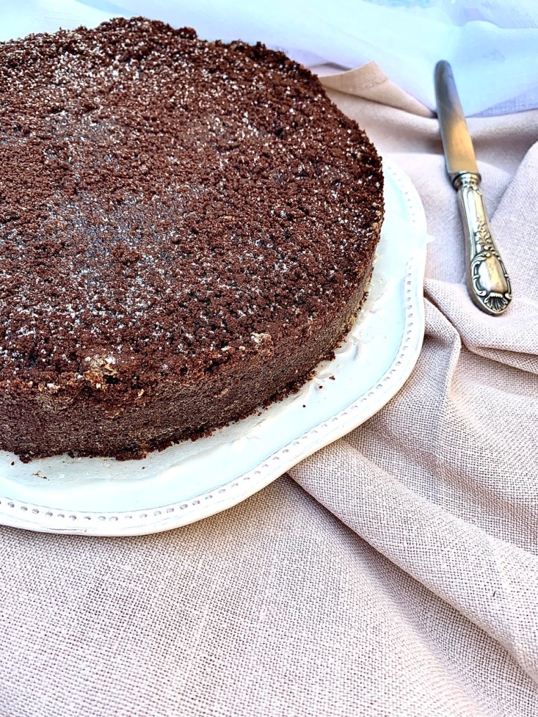 - Una volta freddo, sformate la torta sbriciolata al cacao su un piatto piano, passando un coltello lungo i bordi della tortiera e poi aprendo delicatamente l’anello e sfilandolo.